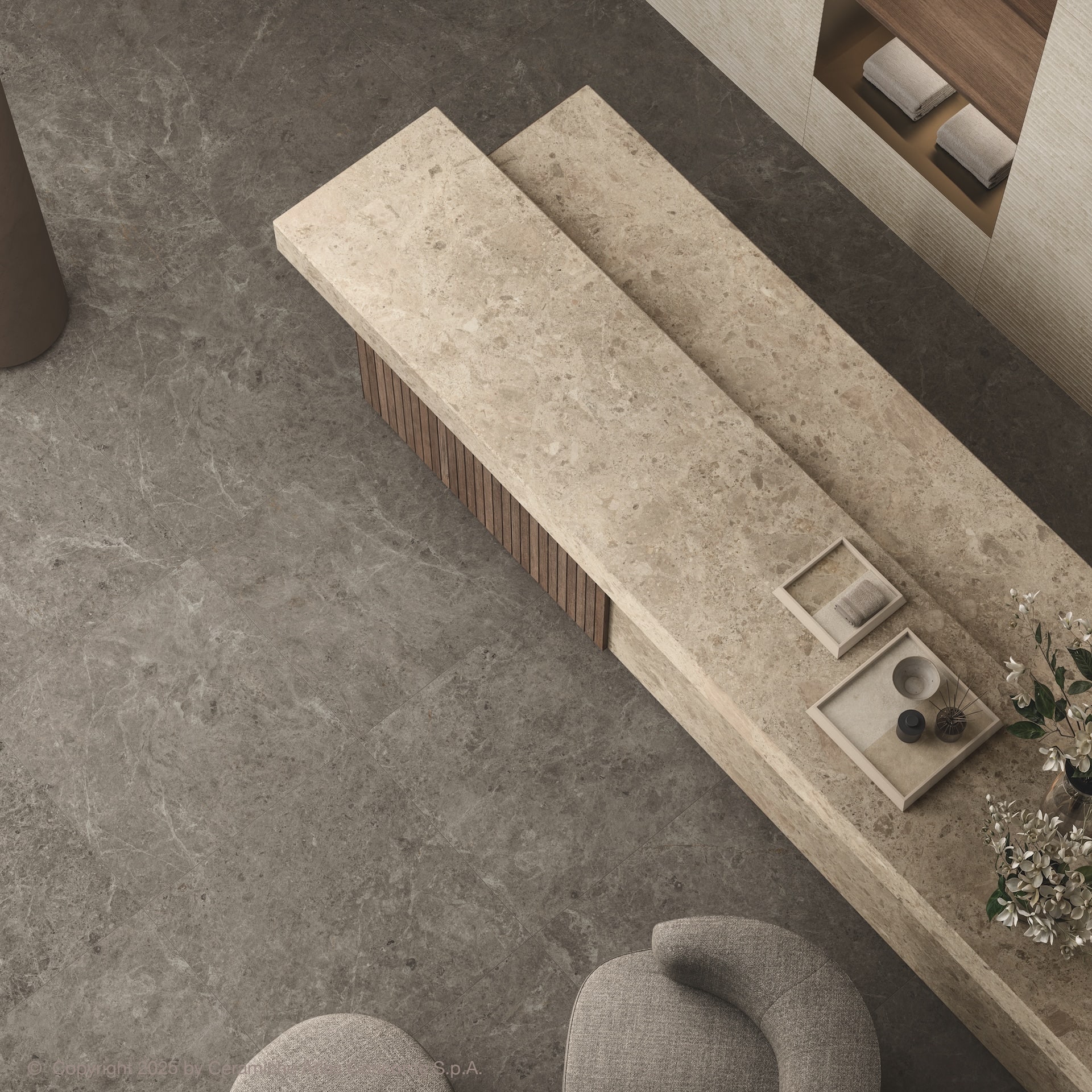 Nyra Ambrosia ist eine Keramikarbeitsplatte, deren reiches und detailgetreues Muster dem Raum Tiefe und Charakter verleiht. Dank der Natura Body Tech-Technologie sind die Farbtöne präzise und gleichmäßig über die gesamte Arbeitsfläche verteilt.