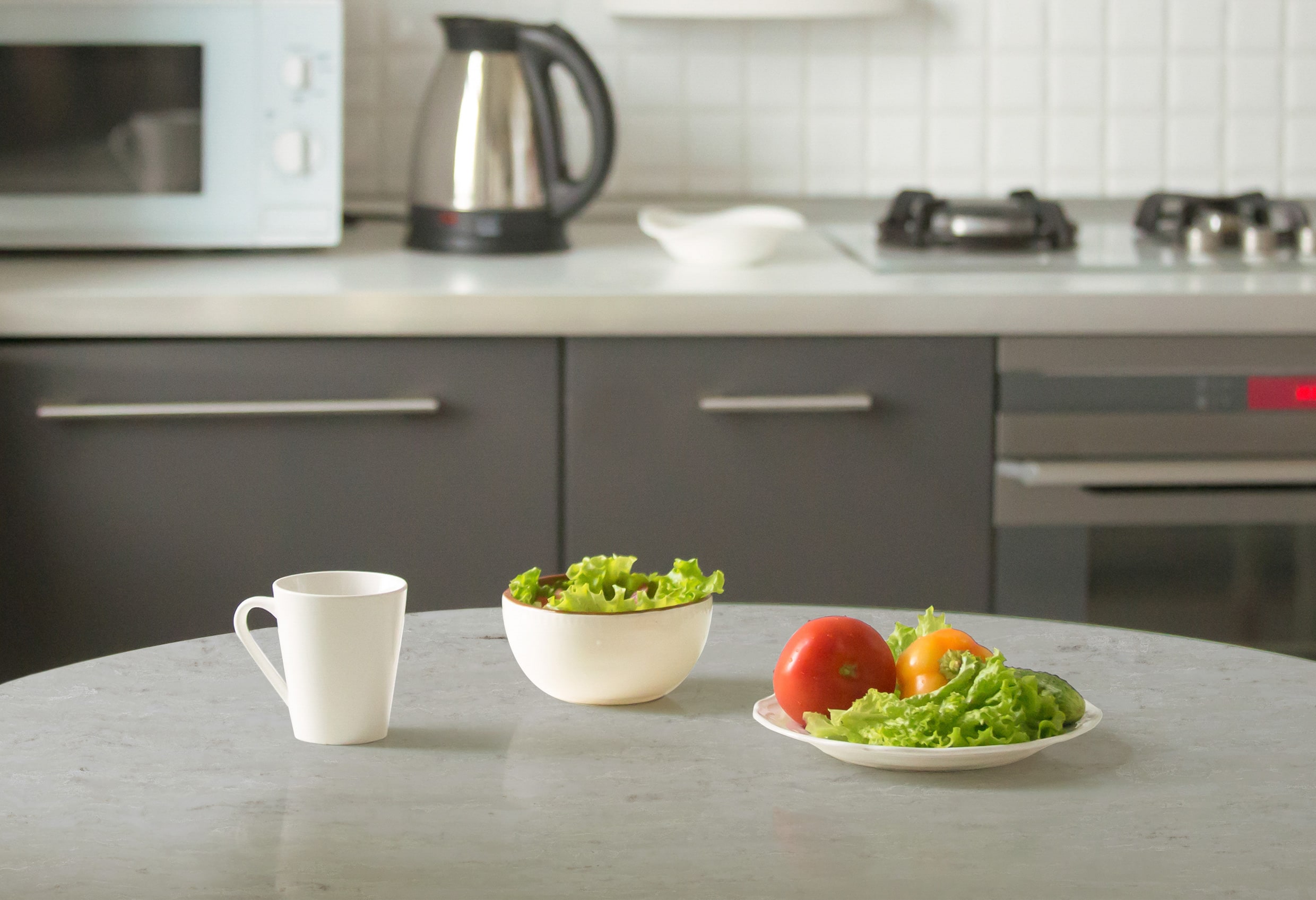 - Material: Arbeitsplatten aus Quarzstein